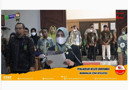 Jum’at 26 Agustus 2022. Pengadilan Negeri Banyumas Melakukan Pelantikan dan Pengambilan Sumpah Kepada Ibu. Yuni Istiati, S.H. sebagai Sekretaris Pada Pengadilan Negeri Banyumas. Pelantikan Ibu. Yuni Istiati, S.H. dipimpin Oleh Ketua Pengadilan Negeri Banyumas Ibu. Wahyuni Prasetyaningsih, S.H., M.H. Selamat Bertugas dan Semoga Sukses. Acara berjalan dengan lancar, hikmat dan tetap mematuhi protokol kesehatan.